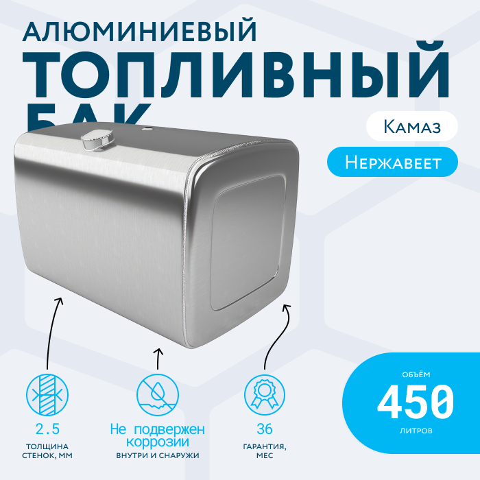 На машинах Камаз 5490 NEO (2018-2020) г. этот бак на 450 л. исползовался с левой стороны на двухосном тягаче (Камаз-5490). Было два варианта комплектовки баками:
